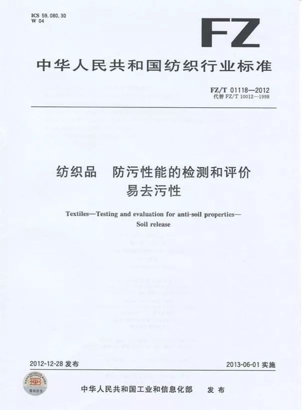 我国关于纺织品防污性能的评价标准主要分为耐污性和易去污性。纺织品耐污性的评价标准主要包括GB/T 30159.1—2013《纺织品 防污性能的检测和评价 第1部分:耐沾污性》和FZ/T 24012—2010《拒水、拒油、抗污羊绒针织品》;纺织品易去污性的评价标准主要包括FZ/T 01118—2012《纺织品 防污性能的检测和评价 易去污性》、FZ/T 10012—1998《涤棉织物易去污性能评定》、FZ/T 14021—2011《防水、防油、易去污、免烫印染布》和GB/T 28895—2012《防护服装 抗油易去污防静电防护服》。