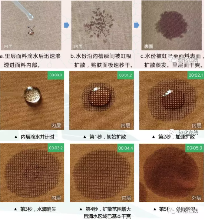 单向导湿:通过织物的内外层亲、疏水性不同,水汽由内层快速导出到外层。