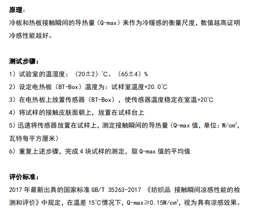 目前国内暂时还没有发布凉感测试标准,不过2016年全国纺织品标委会和全国纺织品标委会基础标准分会上已经审定通过了《纺织品接触瞬间凉感性能的检测和评价》(国标)。也就是此标准发布也是指日可待。我们可以先参考下2010年10月,台湾纺织产业综合研究所「机能性暨产业用纺织品认证与验证评议委员会」已制定的「织物瞬间凉感验证规范」(FTTS-FA-019)产业标准,供业界参考。