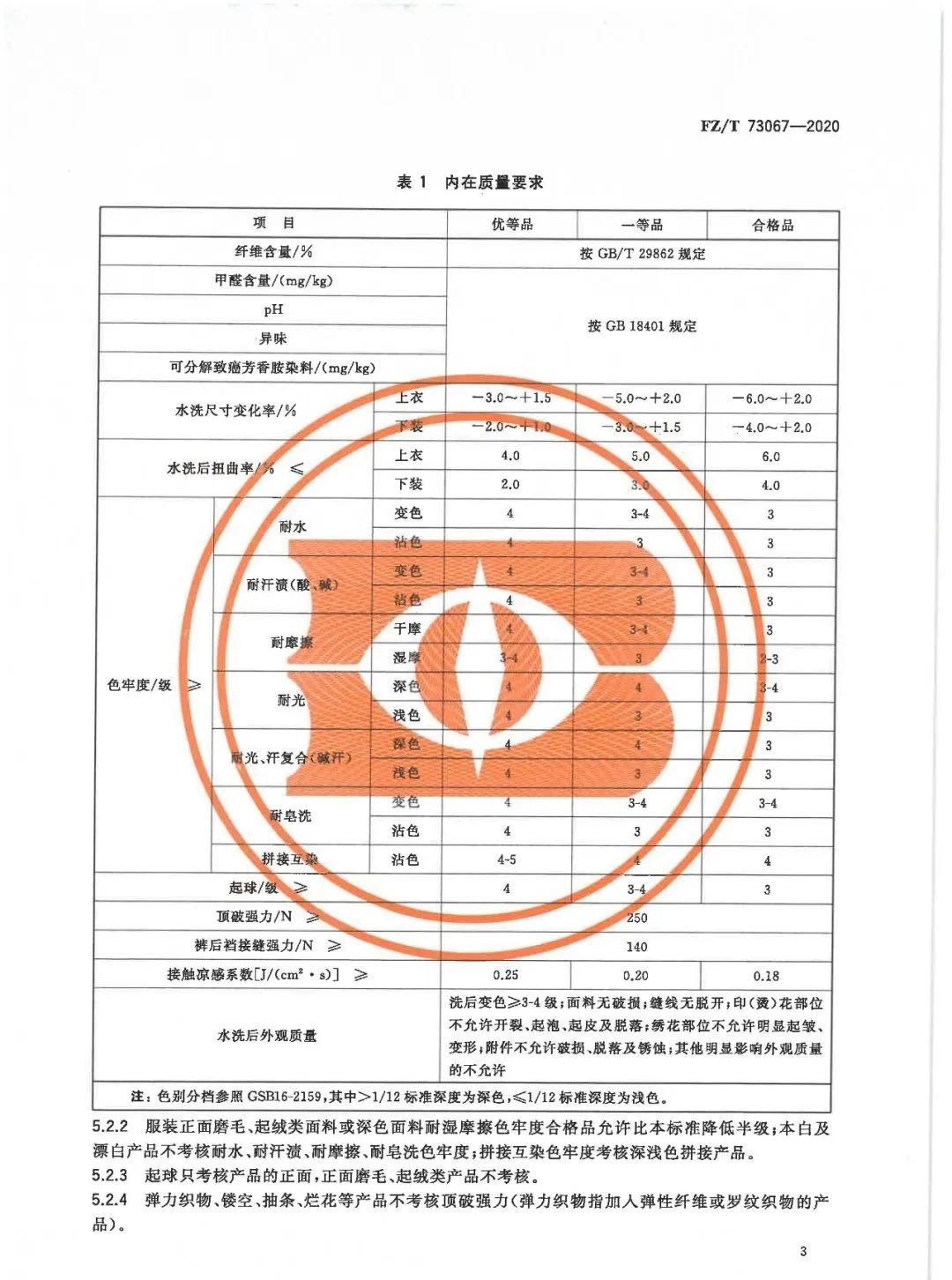 FZ/T 73067《接触凉感针织服装》将产品的凉感功能分为三个等级,优等品服装的接触凉感系数不小于0.25、一等品服装的接触凉感系数不小于0.20、合格品服装的接触凉感系数不小于0.18,这都比GB/T 35263-2017《纺织品 接触瞬间凉感性能的检测及评定》中不小于0.15的要求要高。
