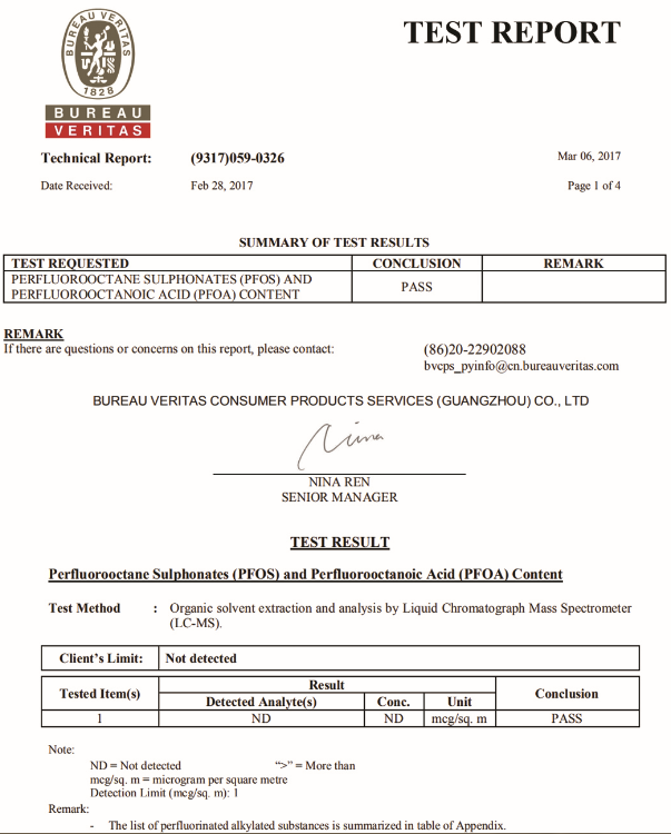 2015年Oeko-tex 100将全氟辛酸(PFOA)的限量条件统一降至<1.0μg/m2,对全氟辛烷磺酰基化合物(PFOS)的限制由≤1.0μg/m2降为<1.0μg/m2。