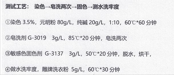 试验结论:1)对于敏感色的泡水牢度、有显著改善