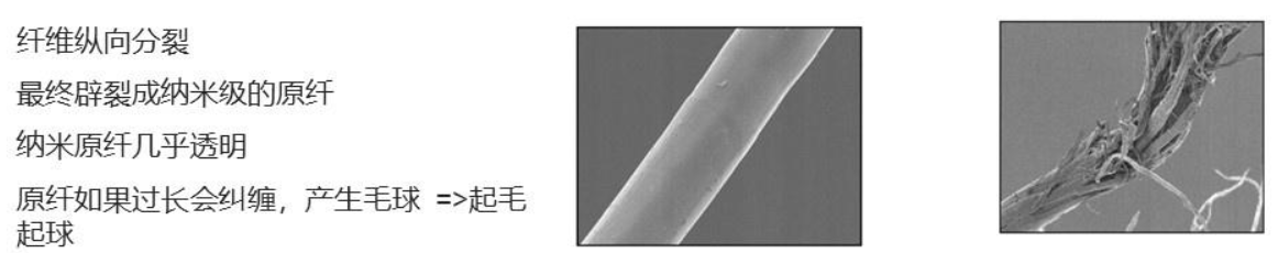 不过莱赛尔纤维制品在湿态下,经机械外力摩擦作用,会产生明显的原纤化现象。这主要是因为莱赛尔纤维轴向取向度较高,微原纤间的横向结合力较弱,在湿态纤维膨化的状态下更减弱了这种结合力,所以使得皮层纤维脱落,残留皮层纤维纵向开裂,形成不均匀的原纤茸毛,使得织物表面呈现出白霜的外观,且常伴随形成白线、白球,再严重的话会使面料不能服用。所以以往莱赛尔纺织品的服用多是生产桃皮绒磨毛风格的服装,却给净面织物的生产和使用带来许多烦恼。