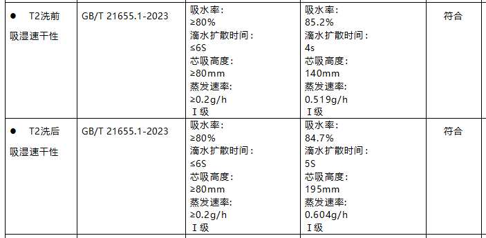 经过处理后的面料,各项指标均符合国标GB/T 21655.1-2023要求。其中吸水率在洗前洗后均≥100%达到二级标准;滴水扩散时间洗前3.58秒达到二级标准,洗后4.12秒达到一级标准;芯吸高度洗前>110mm达到三级标准,洗后信息高度>90mm达到二级标准;干燥速率洗钱洗后均>0.2g/h达到一级标准。