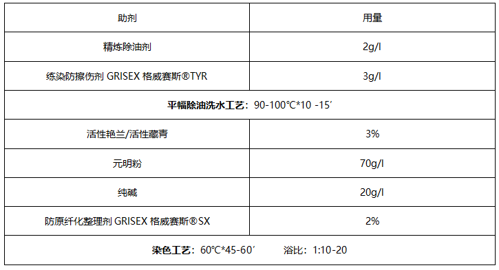 推荐工艺:前处理(建议平幅除油工艺或冷堆)→ 锁纤染色同浴 → 中和 → 皂洗 → 固色 → 过软 → 烘干