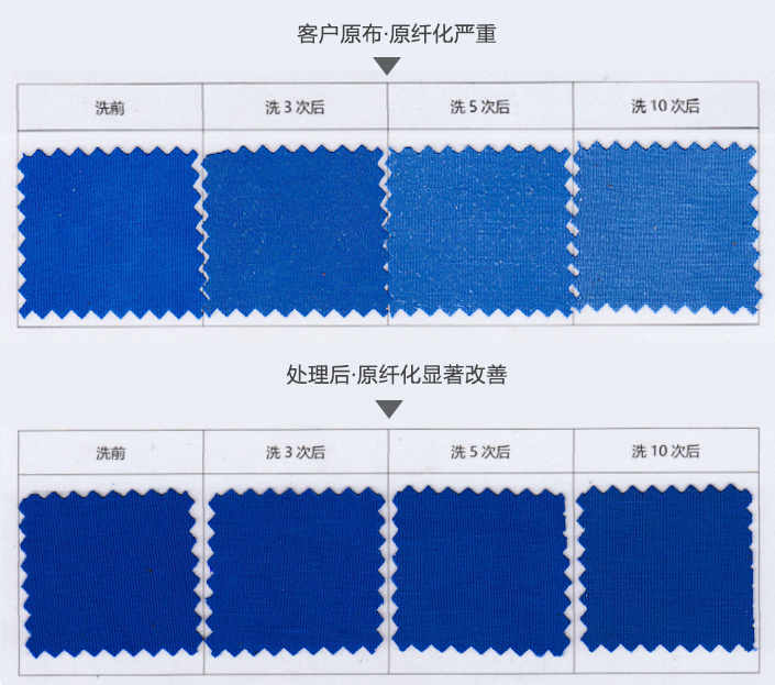 经过处理后的面料,原纤化问题改善明显。(下附电镜图)