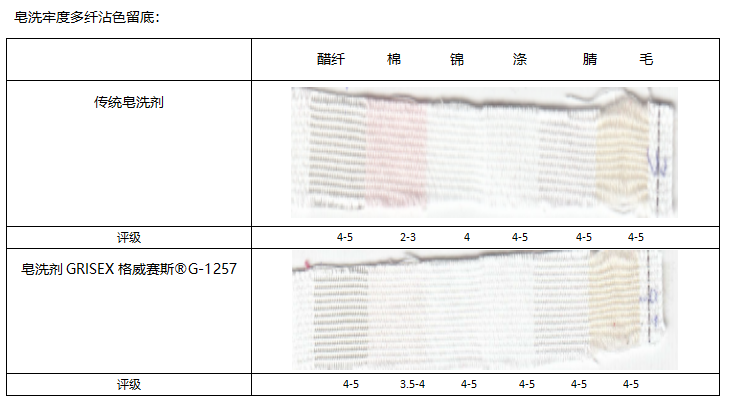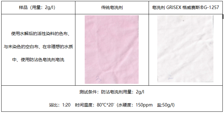 防串色皂洗剂GRISEX格威赛斯®G-1257是为活性染料染色印花研发的防沾皂洗剂,是一款高性能的低温耐盐碱皂洗剂,即使在低温、高电解质及高硬度的水环境下, 也具有高效节能的防沾色与皂洗能力,用于棉及其它纤维素织物的防沾色剂与高性能皂洗剂。