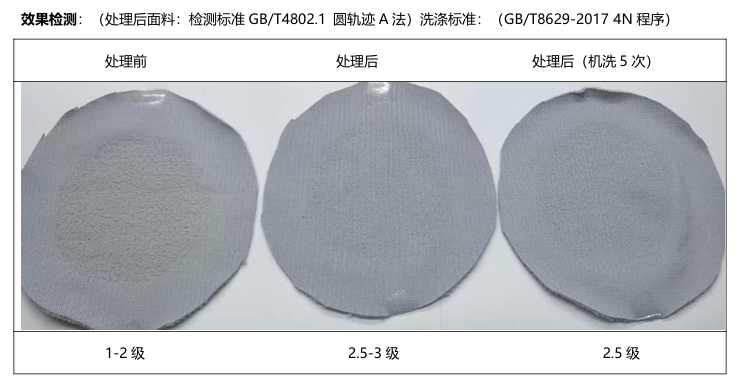 面料经处理后抗起毛起球效果有提升、抗起毛起球剂GRISEX格威赛斯®G-1248为阴非离子产品、建议洗水工艺、如果定型使用、做与手感剂的相容实验
