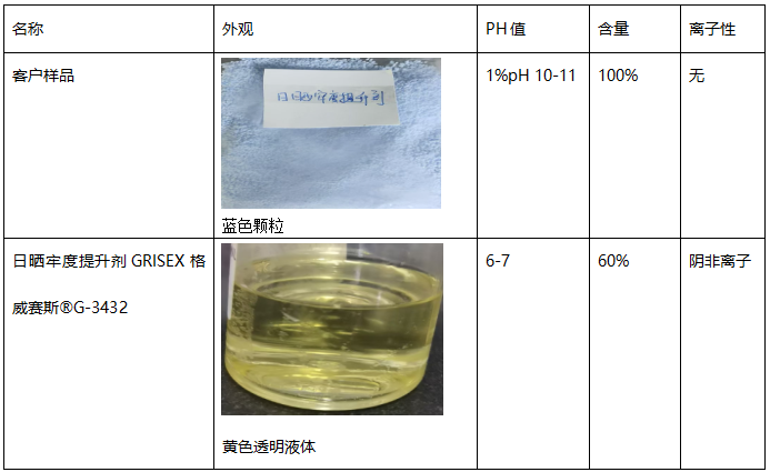 日晒牢度是纺织面料重要的衡量指标之一,市场上的日晒牢度提升剂琳琅满目,怎样挑选一款合适的产品?我们通过分析对比客户提供的一款经典的颗粒状日晒牢度提升剂,发现本司的液体日晒牢度提升剂GRISEX格威赛斯®G-3432与客户现用固体日晒牢度提升剂之间的一些差别。整理成文,供有相似需求的企业参考。
