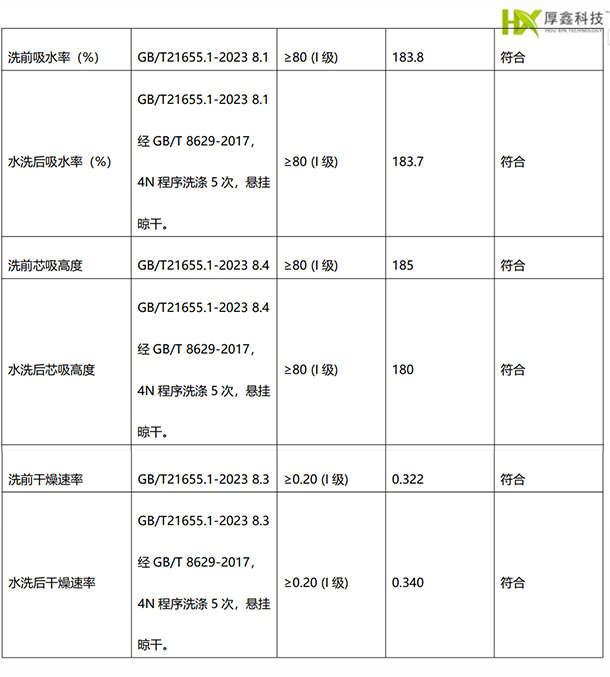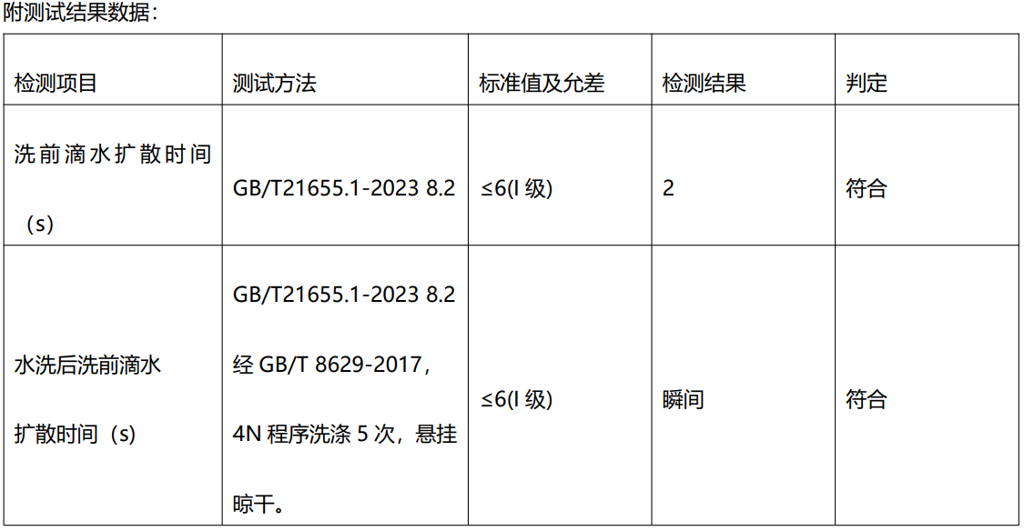 经过处理后的面料,各项指标均符合国标GB/T 21655.1-2023要求。