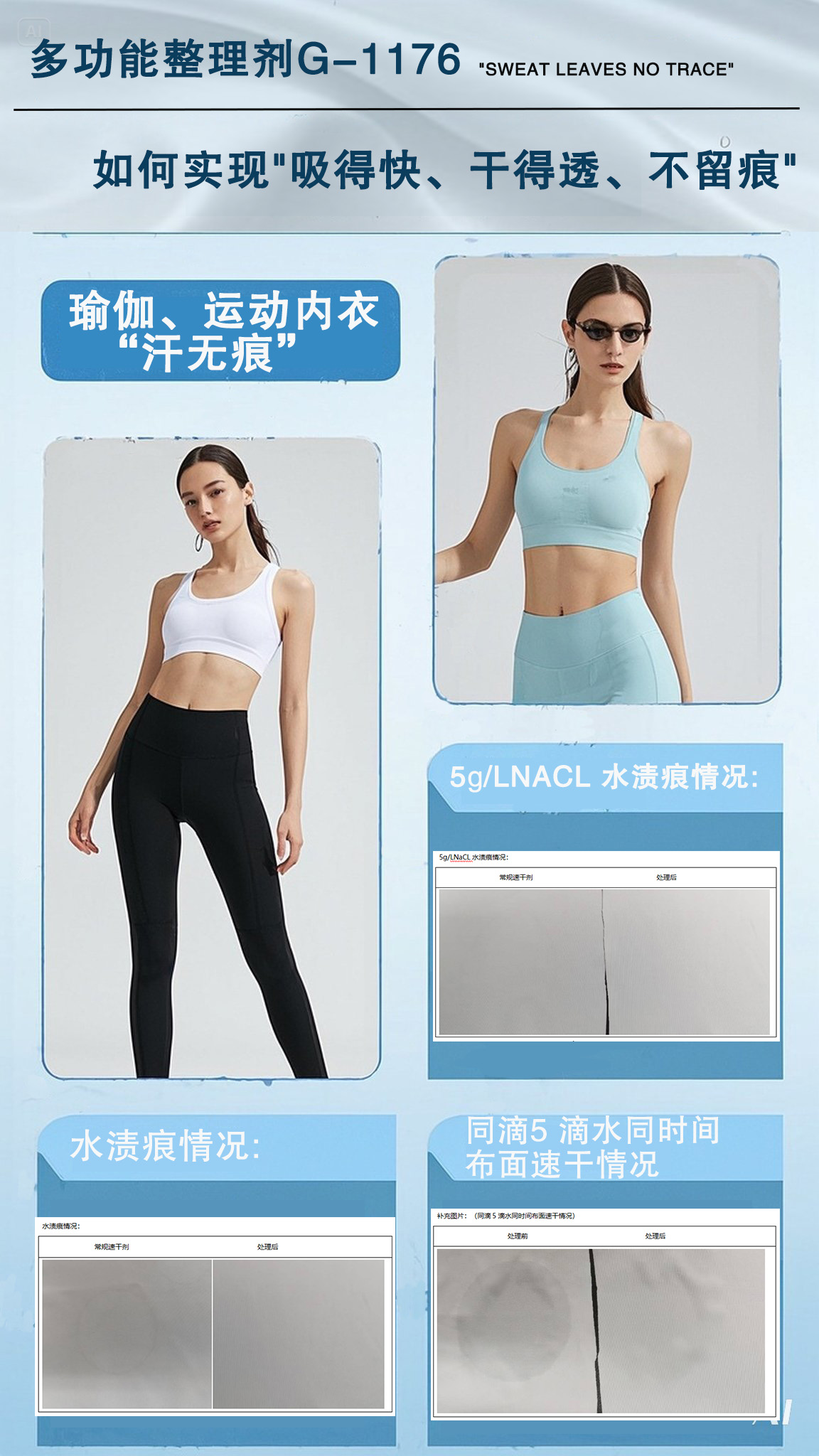 国标GB/T 21655.1-2023对纺织品吸湿速干性提出要求:吸水率需达≥200%,滴水扩散时间≤3s,蒸发速率≥0.25g/h以上。传统亲水整理剂虽能提升吸湿性,却无法解决钠/钙离子与面料表面活性基团结合导致的盐渍残留问题。实验室数据显示,常规助剂处理后的锦纶面料经人工汗液测试后,面料上会有汗印,严重影响产品外观价值。