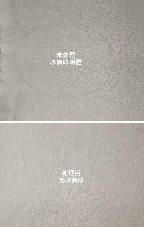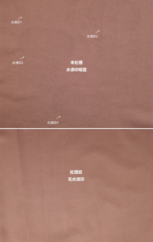 经过处理后的面料,烘干后,均无水渍印,改善显著,符合客户要求!