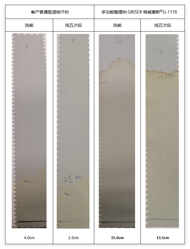 2、多功能整理剂GRISEX格威赛斯®G-1176:能耐高温,各项指标均符合客户要求,且没有水痕。
