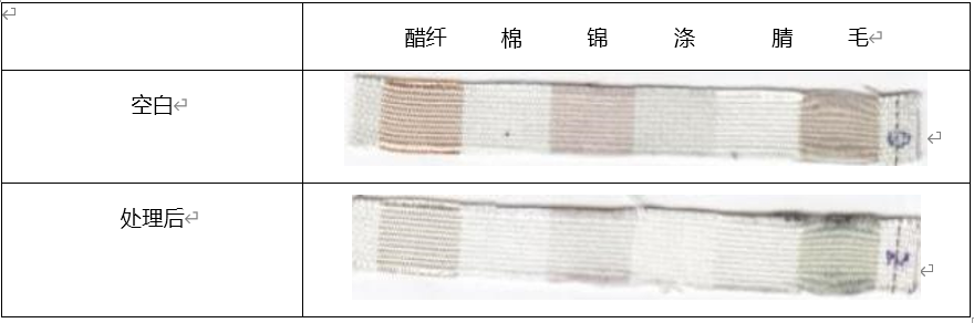 黑色涤纶面料,黑色与白色的拼白(撞色)牢度差,白色沾色严重。客户要求牢度需要从3.5级提高到4级。为满足客户需求,经过本司技术中心快速筛选定位,制成此方案,解决了客户长期的此类困扰。