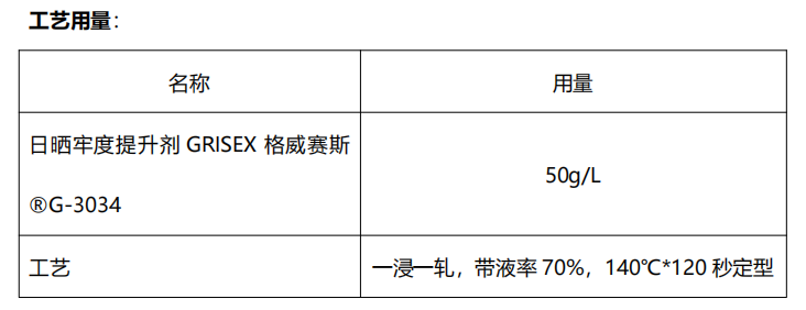 经过日晒牢度提升剂 GRISEX 格威赛斯®G-3034 处理后能提升 0.5-1 级左右。