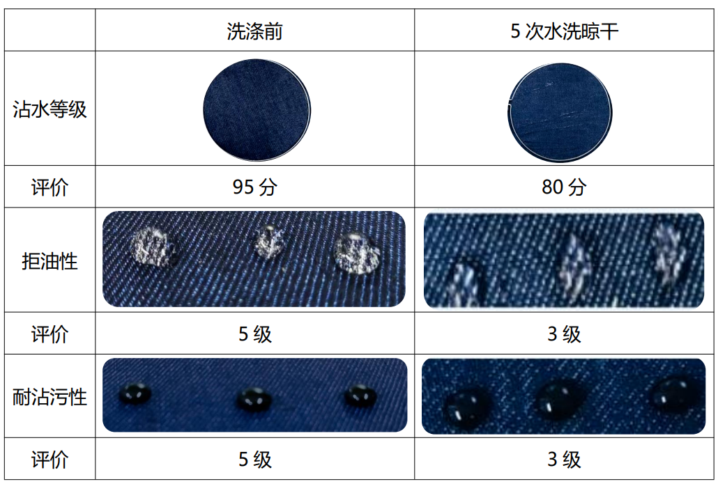 在追求极致功能与环保共生的今天,四面弹蓝黑牛仔面料的三防整理技术,正面临前所未有的挑战。厚重织物纤维结构复杂,全面的防水、拒油、防污性能,并经受5次水洗晾干考验。安氟诺®RH-2449 三防整理剂,正是为征服这一极限而生,助力面料通过国标严苛检测,开启高性能牛仔新纪元。