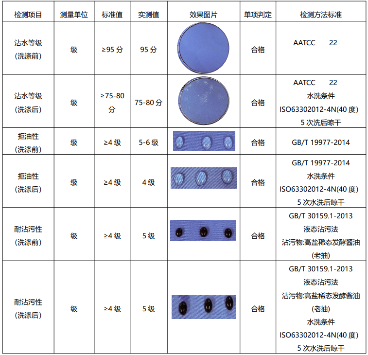涤棉面料做三防处理,要达到GB/T 19977-2014《纺织品拒油性抗碳氢化合物试验》、GB/T 30159.1-2013《纺织品防污性能的检测和评价第1部分-耐沾污性》、AATCC 22《纺织品防水性能的检测和评价沾水法》标准。