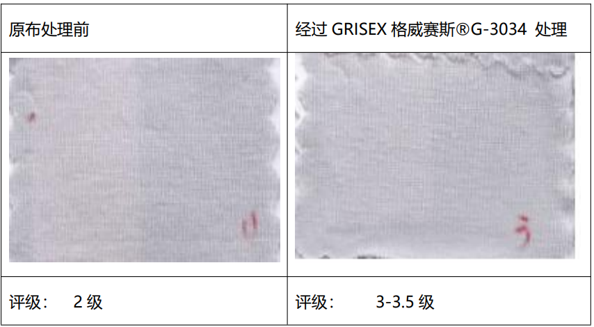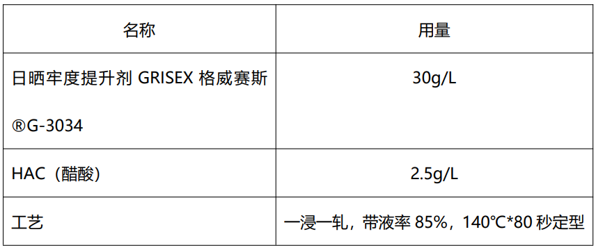 经过日晒牢度提升剂 GRISEX 格威赛斯®G-3034 处理后能提升 1 级左右;能做到客户要求; 工作液 pH 值 3-4,布面 pH 值 6-7,以第三方检测为准,结果供参考。