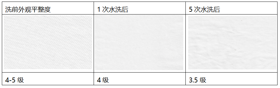 经过处理后的面料,5次水洗后外观平整度达到3.5级,满足客户要求。