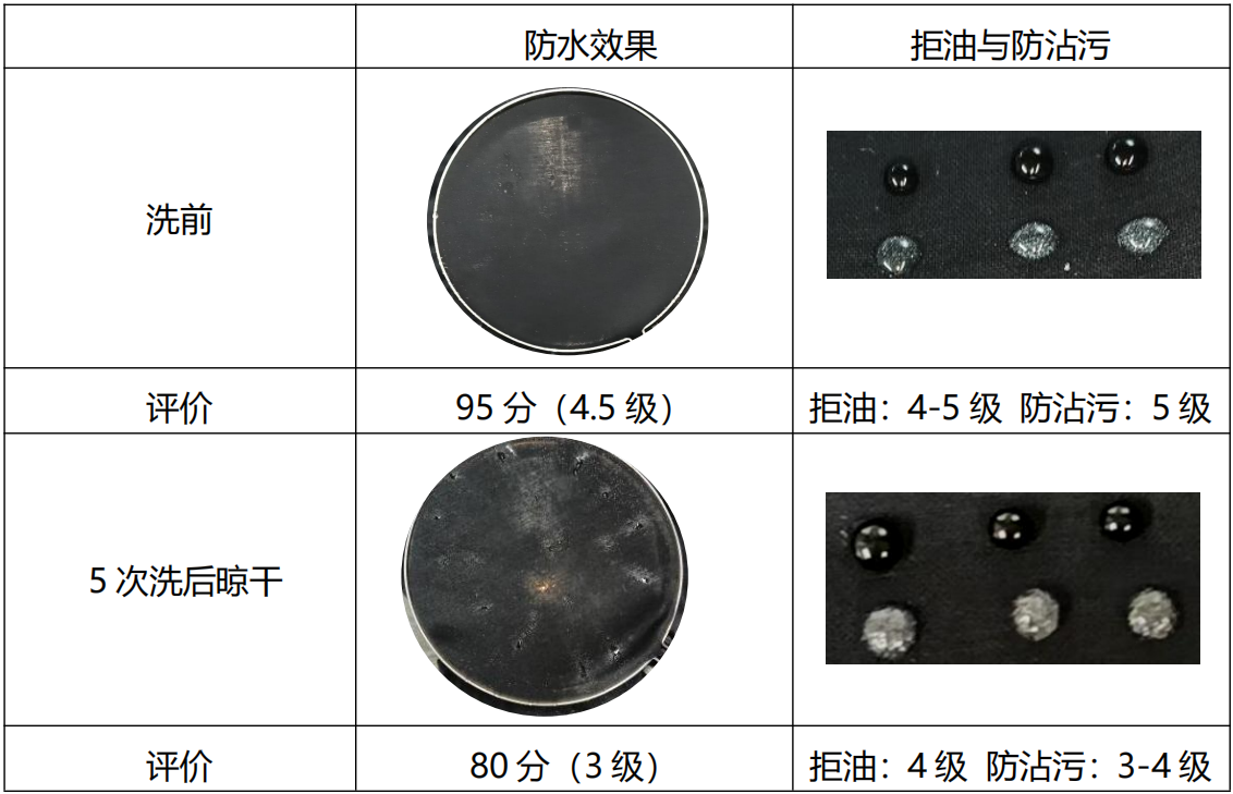 防沾污效果可做到:洗前拒油 5 级;洗后拒油 4 级。