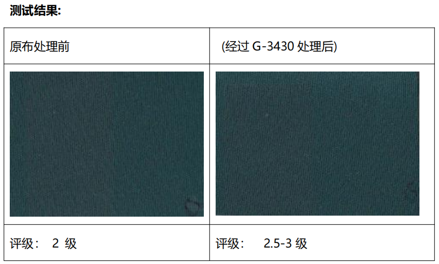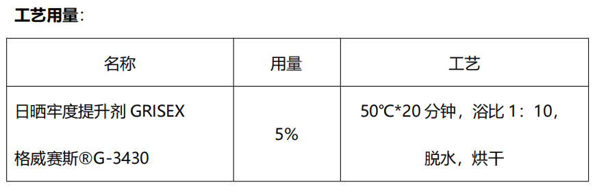 经过日晒牢度提升剂GRISEX格威赛斯®G-3430处理后能提升0.5-1级左右。