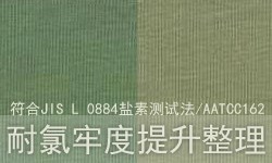盐素测试耐100ppm氯水,提高纤维素纤维用活性染料染色与印花时的耐氯漂牢度。效果比CF-2更好。JIS L 0884 盐素处理水色牢度测试3-4级,耐洗。